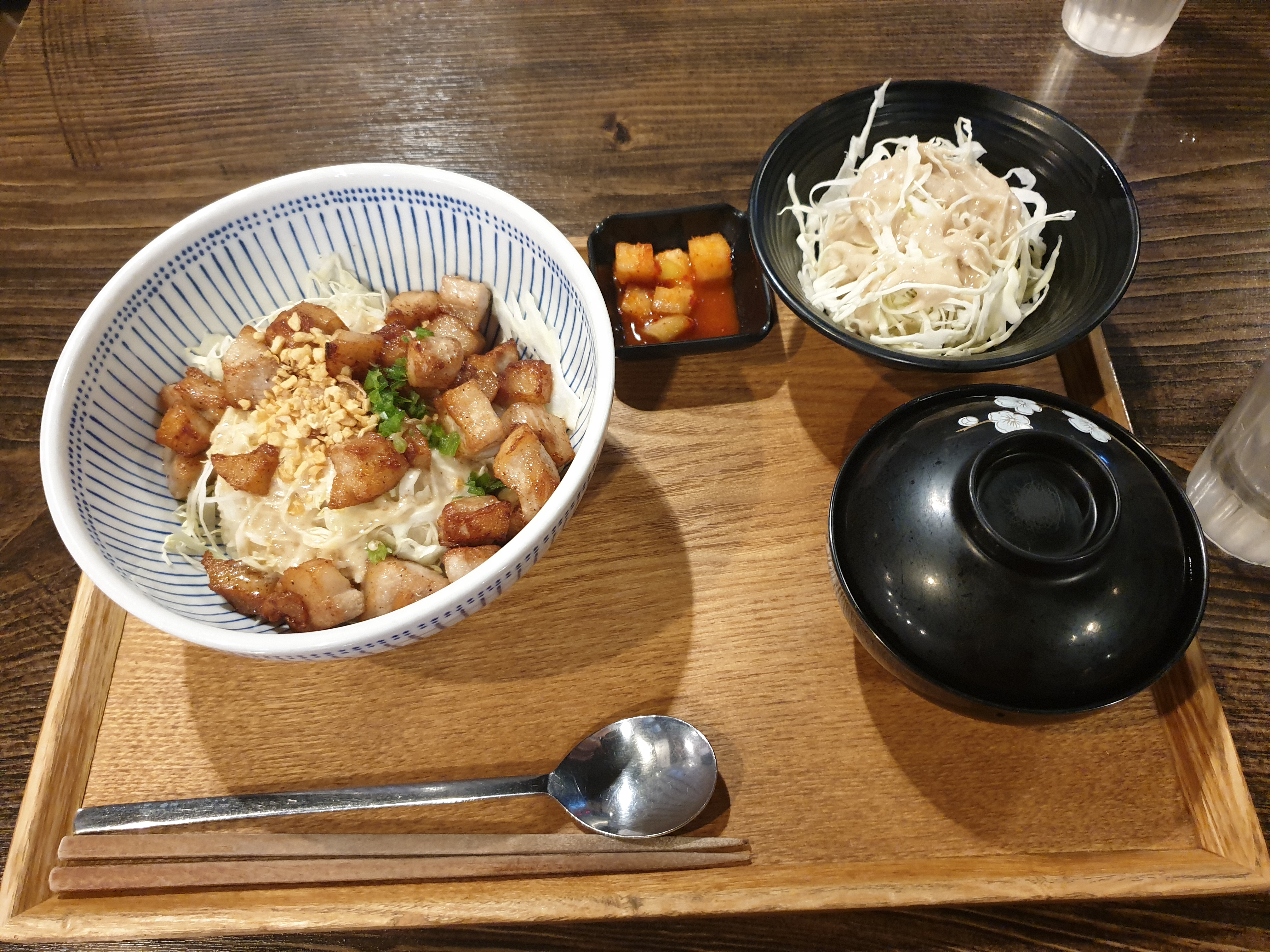 돈토로동 정식이다. 소스는 약간 아몬드와 마요네즈가 섞인 맛있는 소스이다. 항정살과 잘어울리는 소스이다.